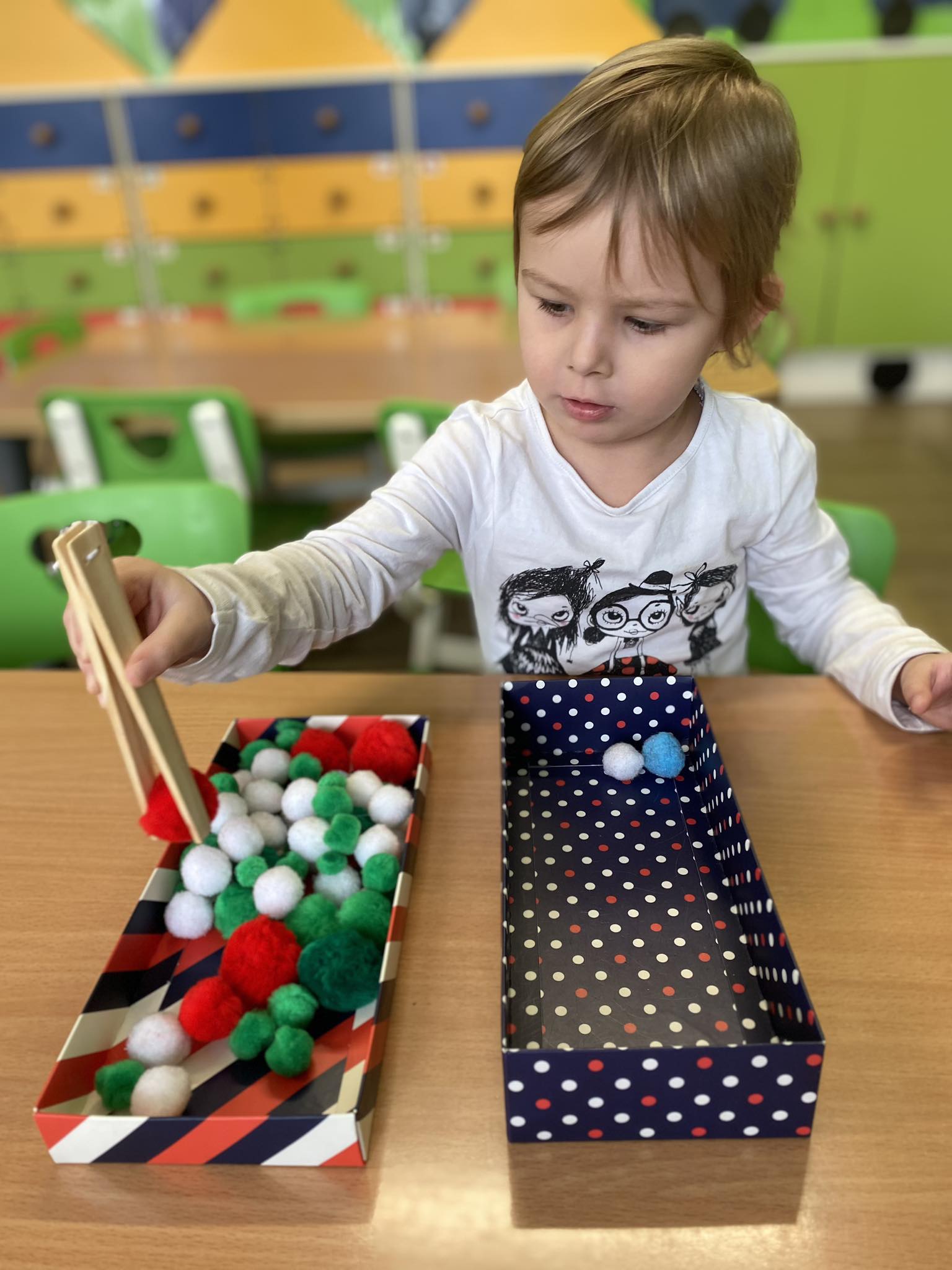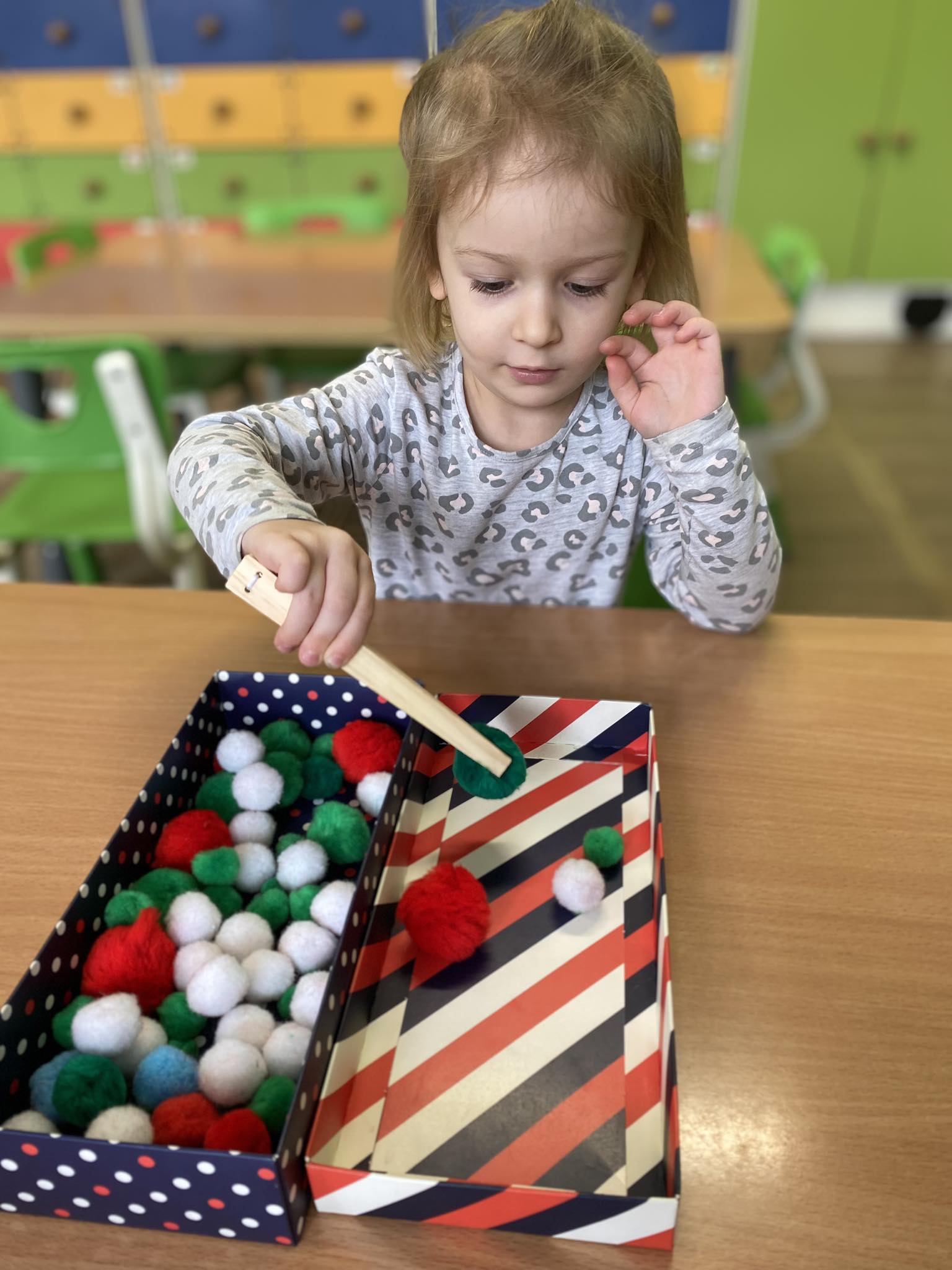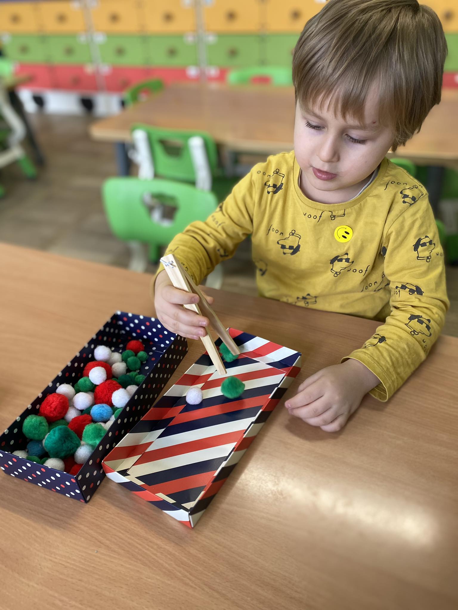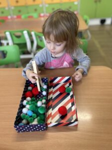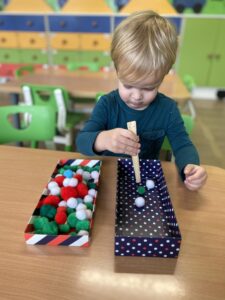 W piątek Żabki podczas zajęć sensoryczno-motorycznych ćwiczyły motorykę małą. Zadaniem dzieci było przenoszenie kolorowych pomponów z jednego pojemnika do drugiego przy użyciu drewnianej „pęsety”. Pracy było co nie miara, ale przy tym nasze rączki bawiąc się ćwiczyły 🙂