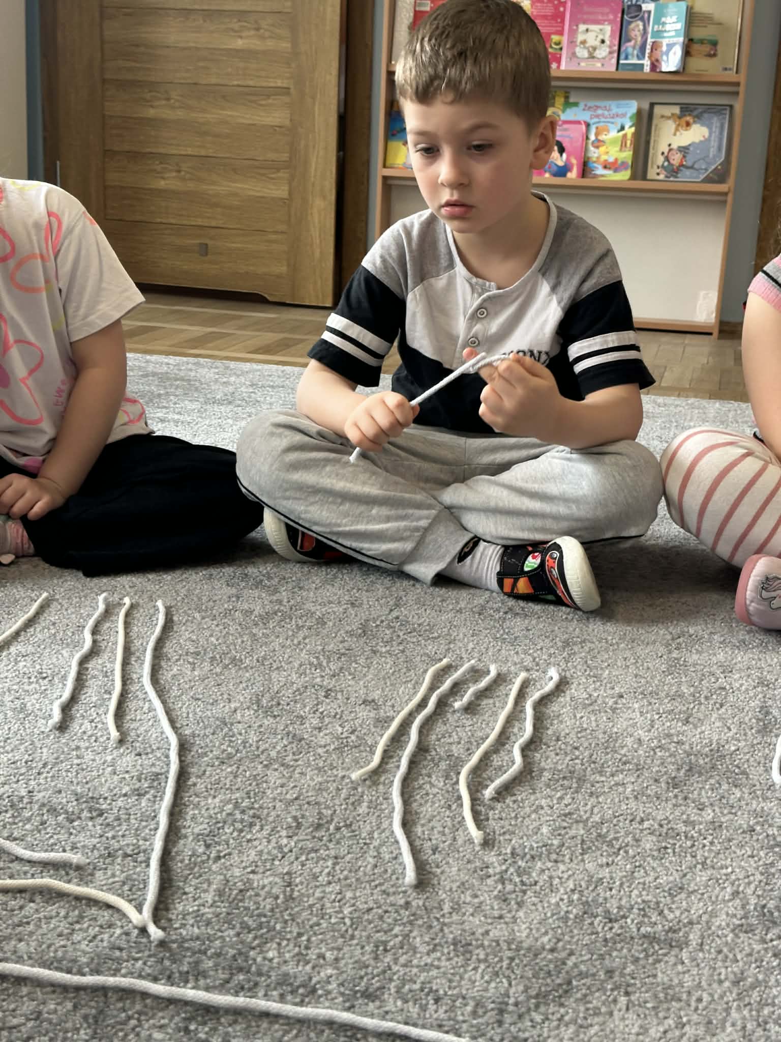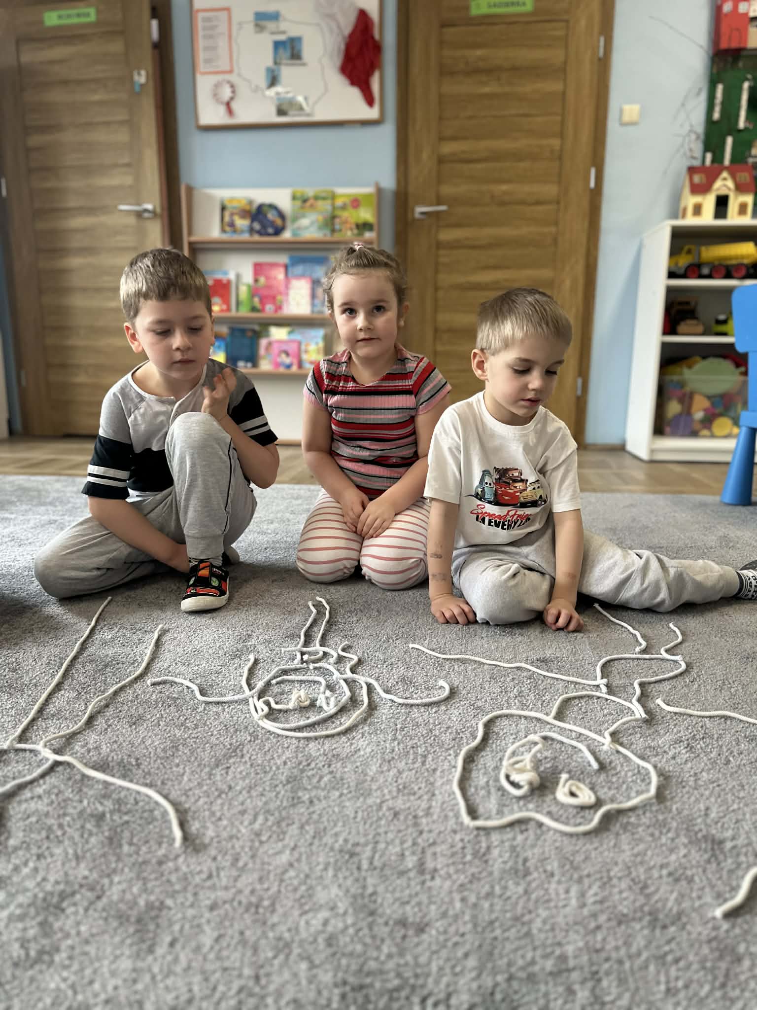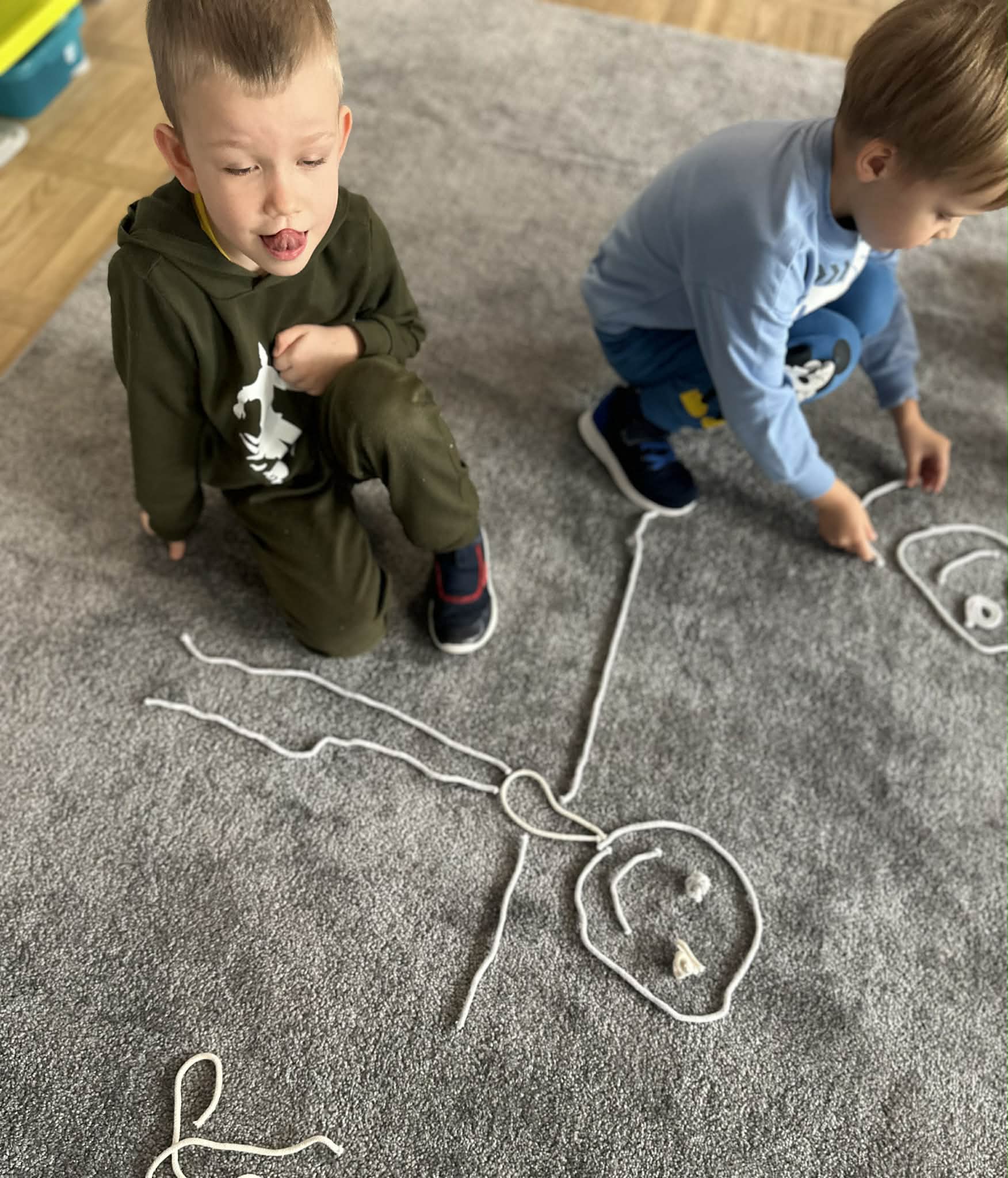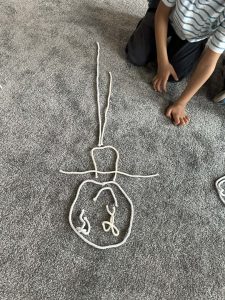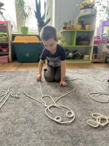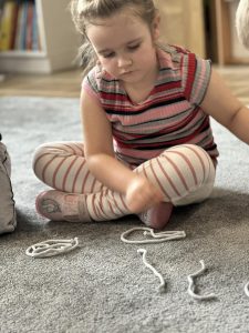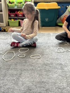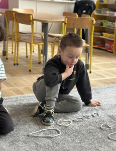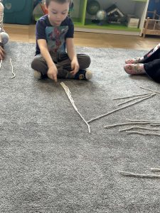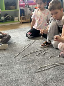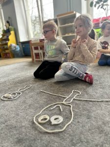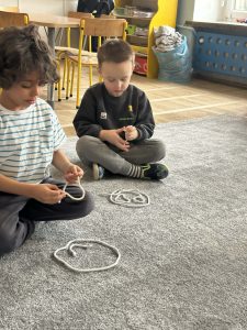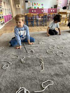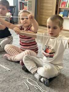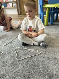 Sznurek może być wykorzystywany jako pomoc do zabaw manipulacyjnych, które rozwijają sprawność dłoni i palców. Tropiciele zwijali ,rozwijali sznurek,ćwiczyli koordynację ręka–oko oraz motorykę małą. Podczas zabawy dzieci układały ze sznurka różne figury i kształty, np. koło, kwadrat, trójkąt czy fale. Takie działania rozwijają wyobraźnię przestrzenną, kreatywność oraz umiejętność rozpoznawania kształtów. Manipulowanie sznurkiem pomaga również w koncentracji i cierpliwości.