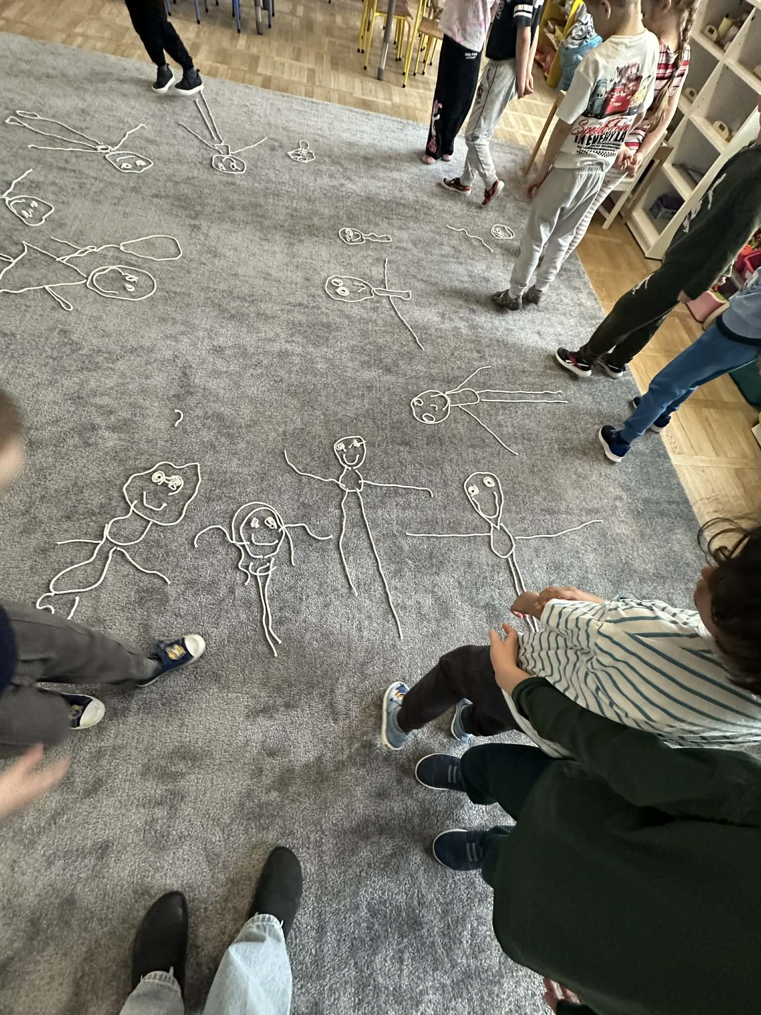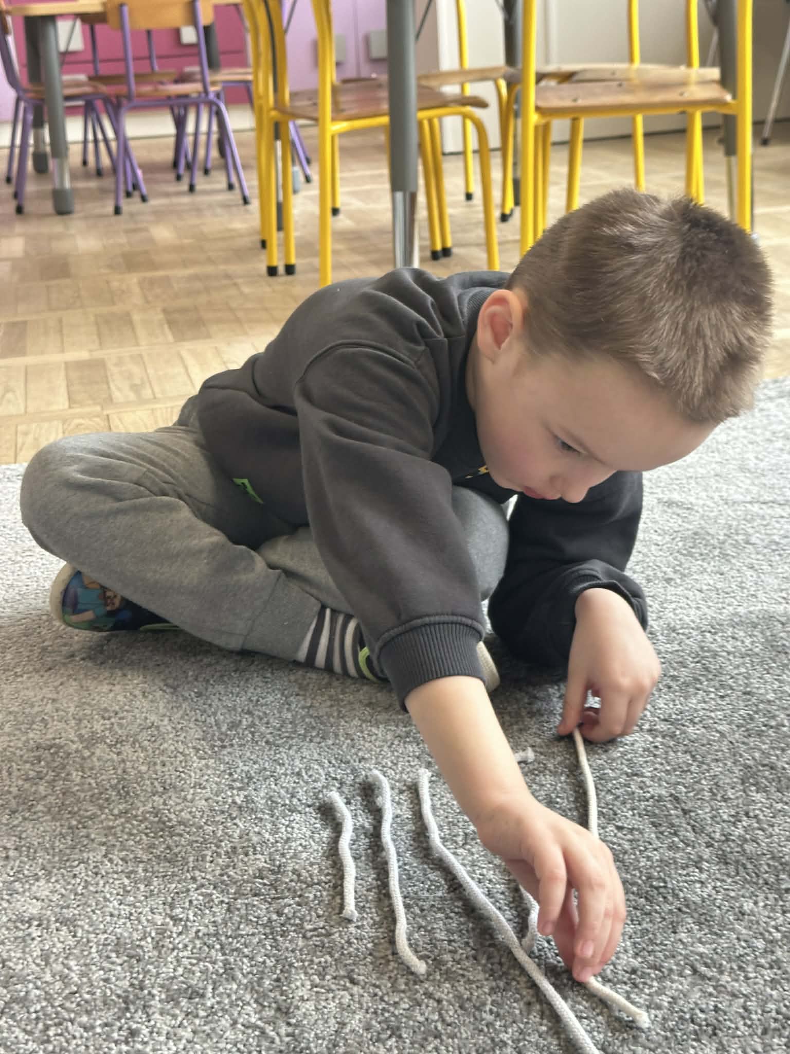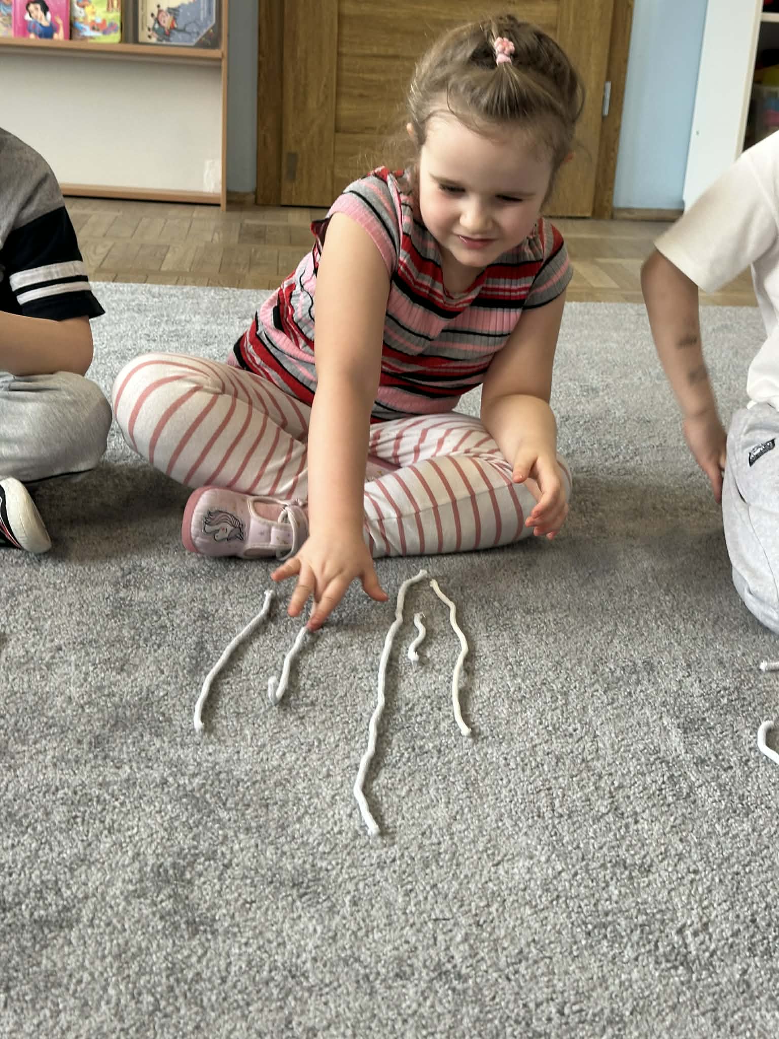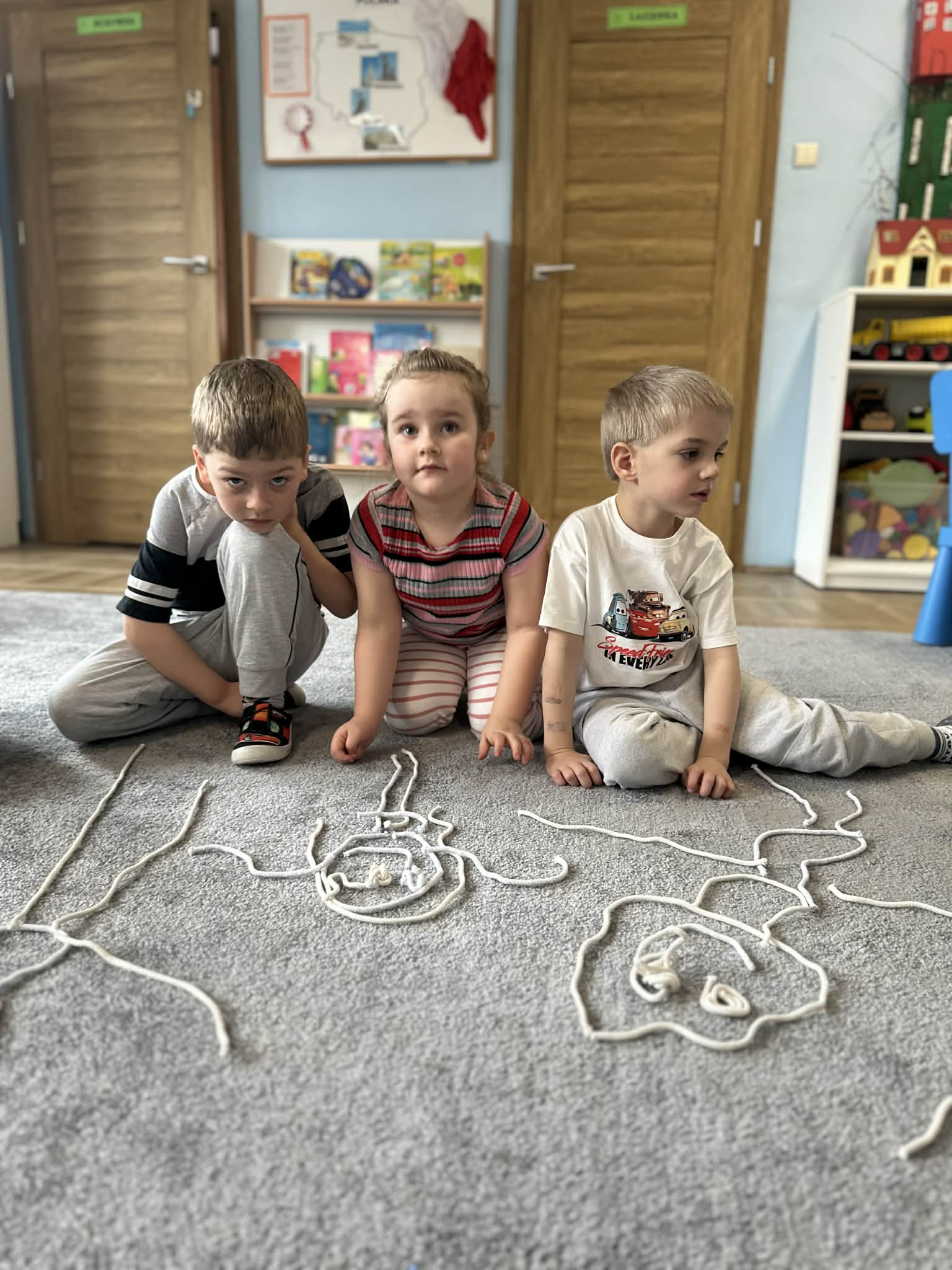 Sznurek może być wykorzystywany jako pomoc do zabaw manipulacyjnych, które rozwijają sprawność dłoni i palców. Tropiciele zwijali ,rozwijali sznurek,ćwiczyli koordynację ręka–oko oraz motorykę małą. Podczas zabawy dzieci układały ze sznurka różne figury i kształty, np. koło, kwadrat, trójkąt czy fale. Takie działania rozwijają wyobraźnię przestrzenną, kreatywność oraz umiejętność rozpoznawania kształtów. Manipulowanie sznurkiem pomaga również w koncentracji i cierpliwości.