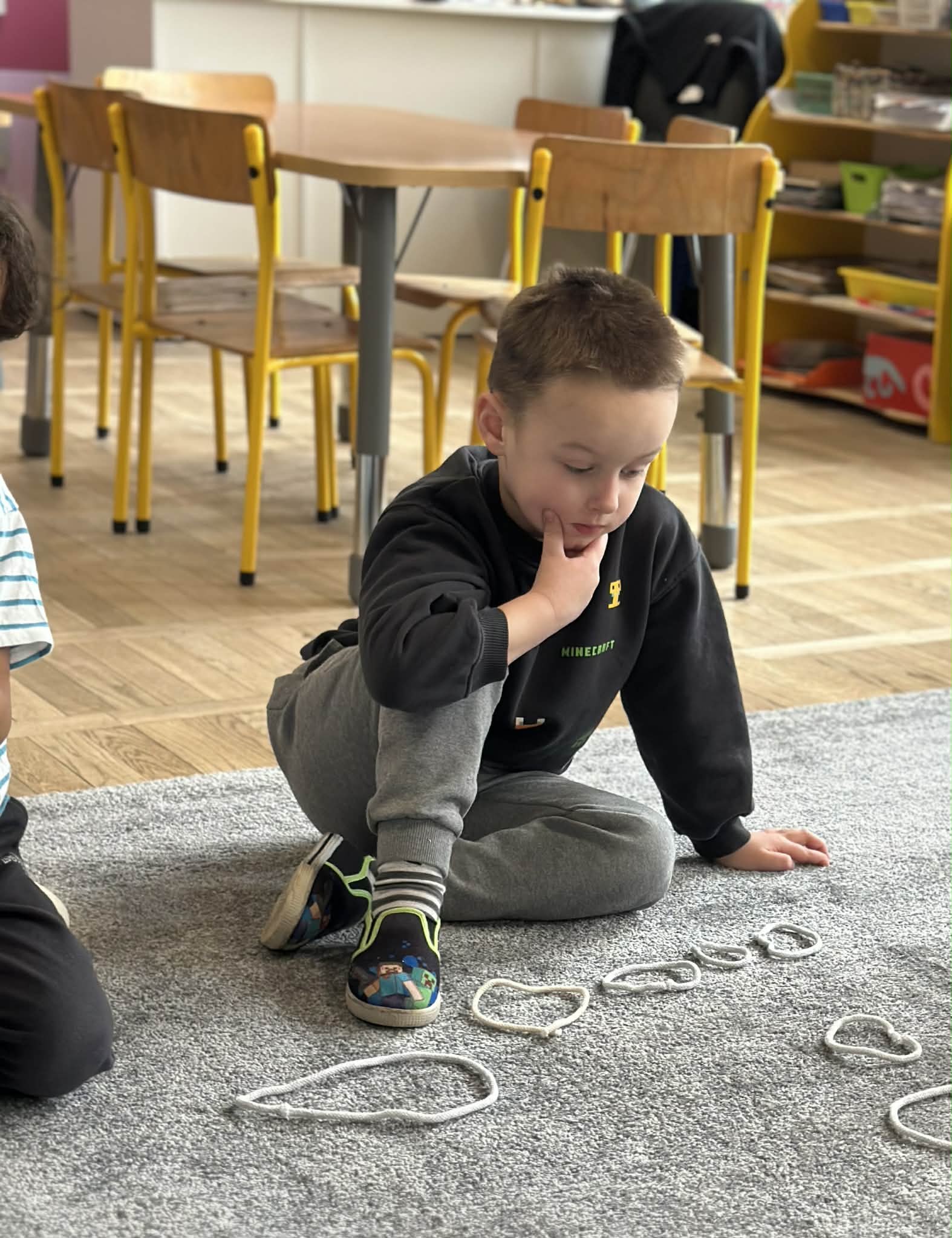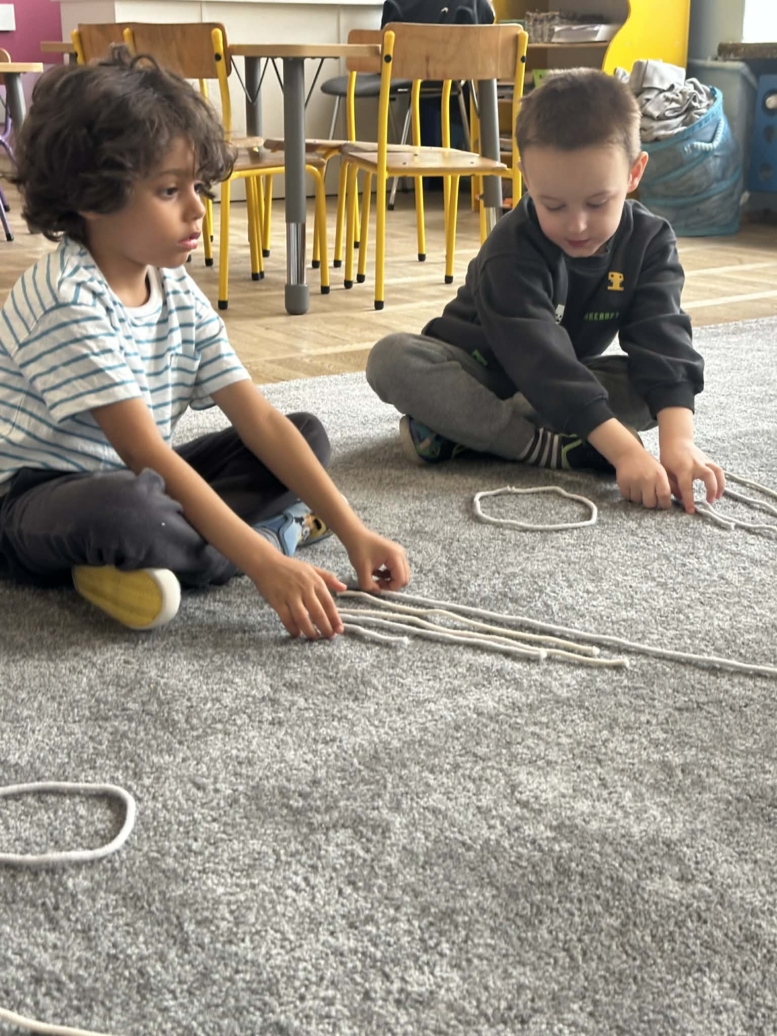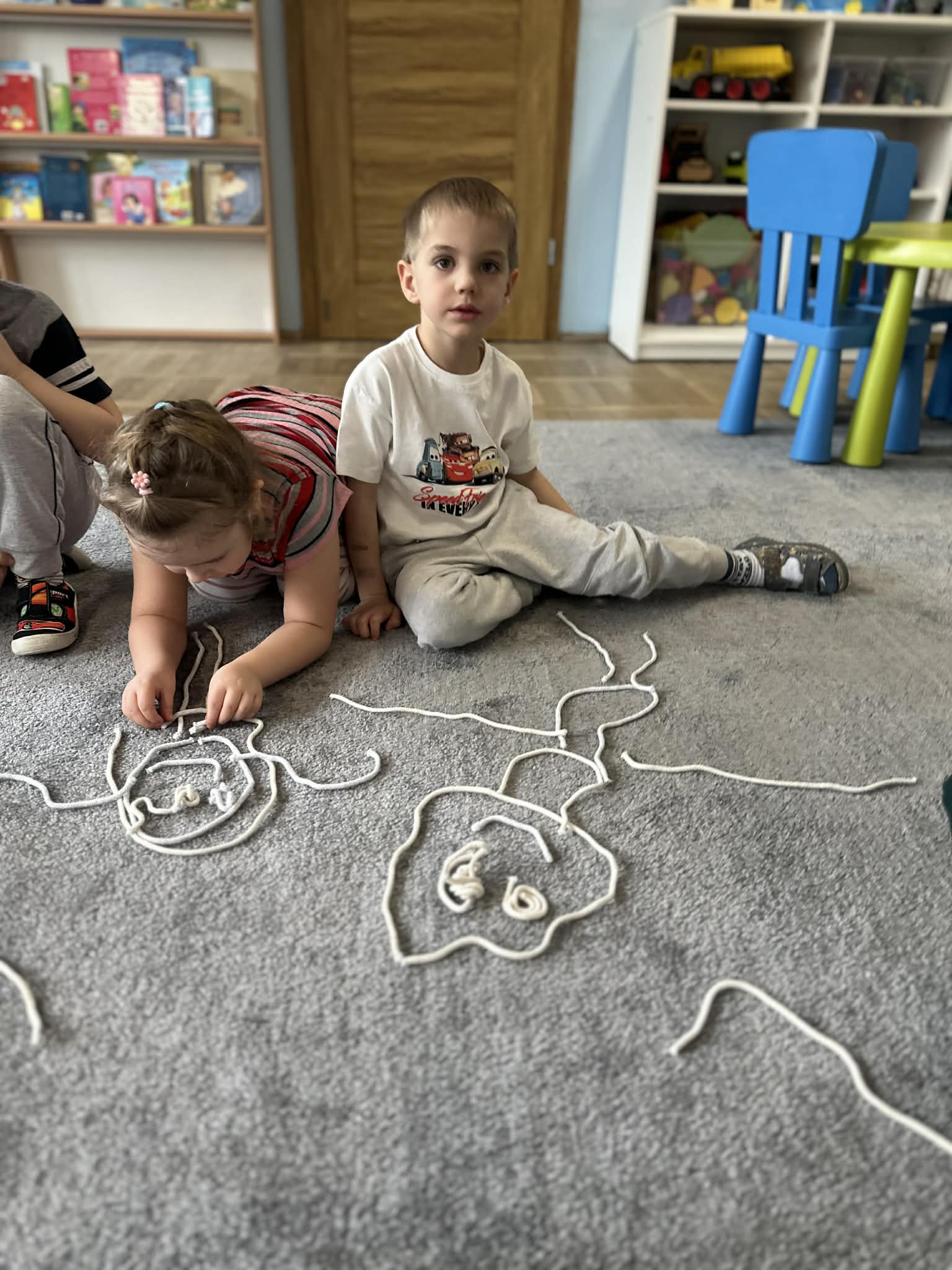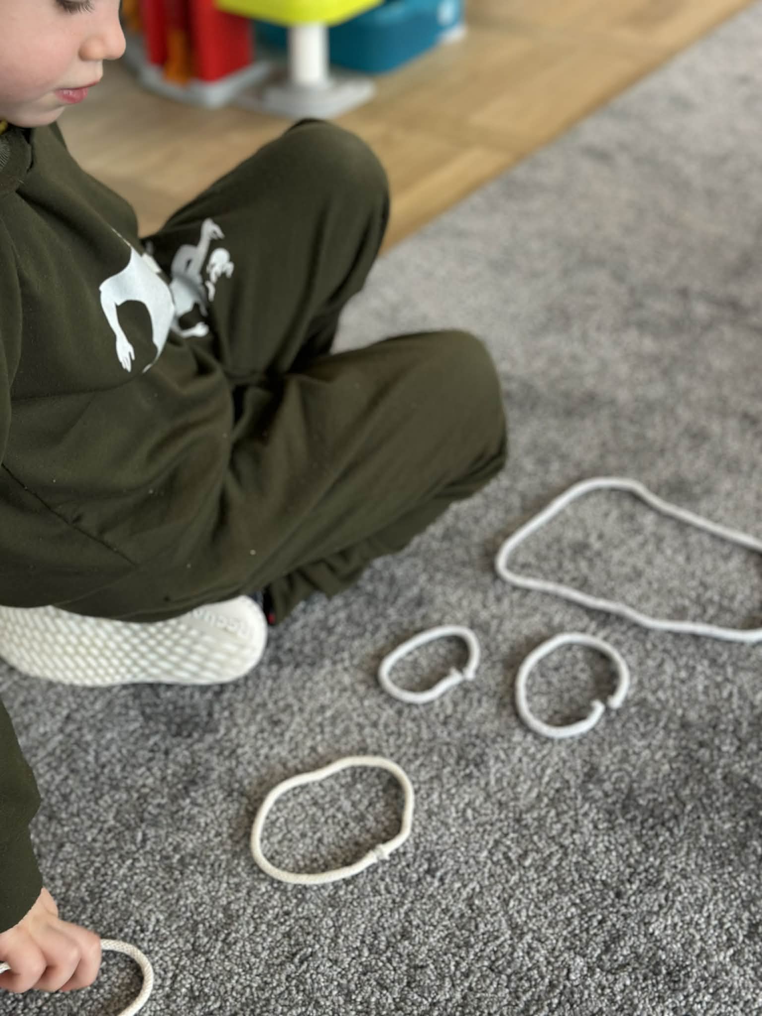 Sznurek może być wykorzystywany jako pomoc do zabaw manipulacyjnych, które rozwijają sprawność dłoni i palców. Tropiciele zwijali ,rozwijali sznurek,ćwiczyli koordynację ręka–oko oraz motorykę małą. Podczas zabawy dzieci układały ze sznurka różne figury i kształty, np. koło, kwadrat, trójkąt czy fale. Takie działania rozwijają wyobraźnię przestrzenną, kreatywność oraz umiejętność rozpoznawania kształtów. Manipulowanie sznurkiem pomaga również w koncentracji i cierpliwości.